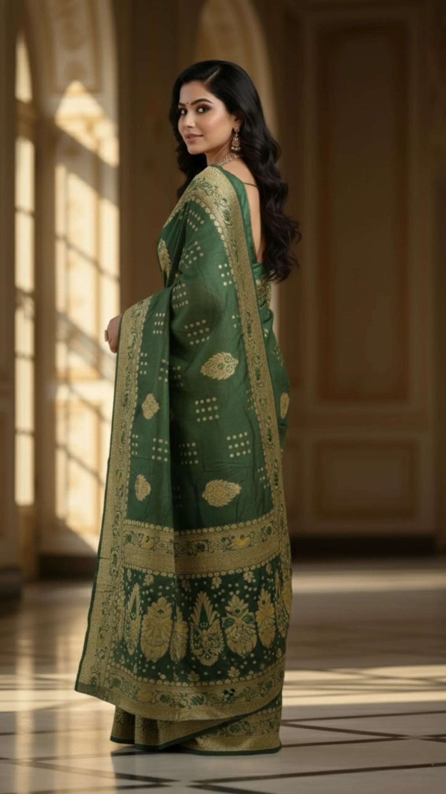 If you’re searching for a saree that gives a royal, classy, and premium look, this Bottle Green Dola Silk Saree is the perfect addition to your ethnic wardrobe.